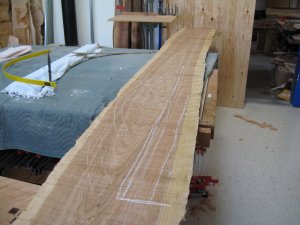At this point the top was ready to start sloshing finish on, and it was time to construct the base. Since everything readily visible was built from four sequential 5/4 planks from a single tree, the first step was milling and gluing up blanks for the legs and other thick parts. Daughter Meghan stayed late that night to keep me on task and lend a hand. Another day she brought me Cirello’s pizza–Love you Meg!
