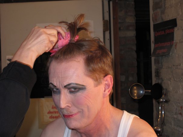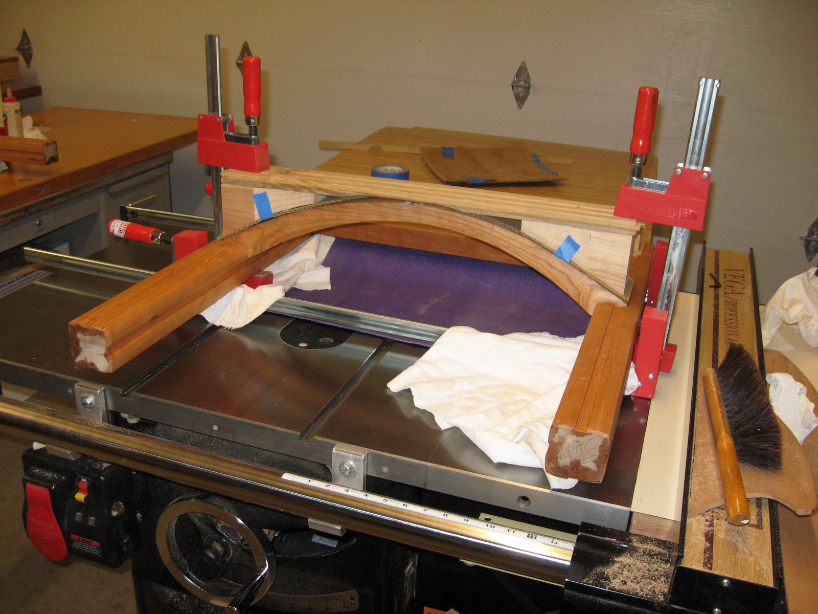 Here is the end subassembly finally glued and clamped, with fancy cauls that David made to handle the curving stretchers.