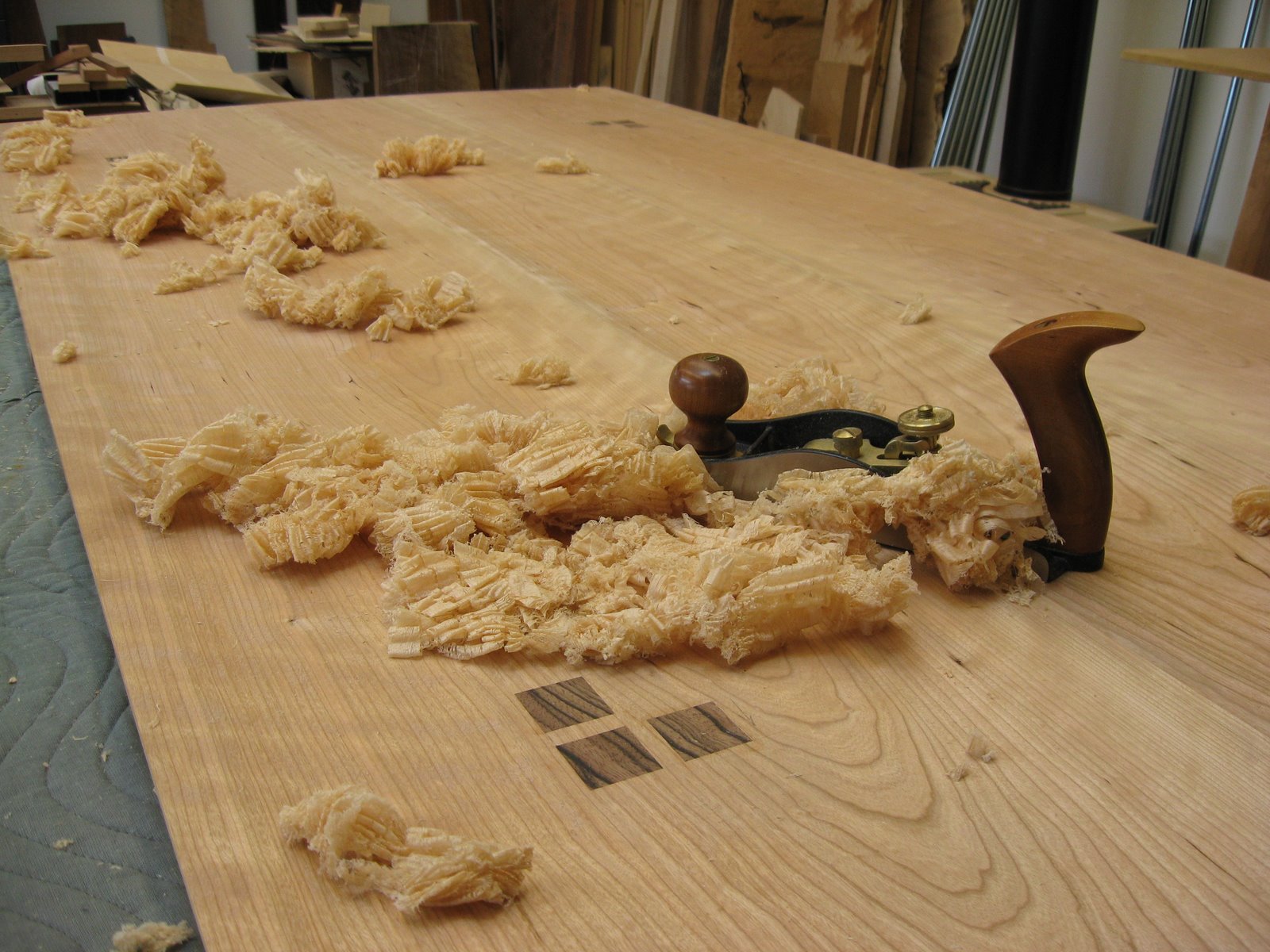 Then it was time to level and smooth the top, a real extravaganza of fluffy shavings. I had to sharpen frequently to avoid tearing out the reversing grain of the quilted cherry, and it turned out splendid–thankfully, because it was a ton of work.