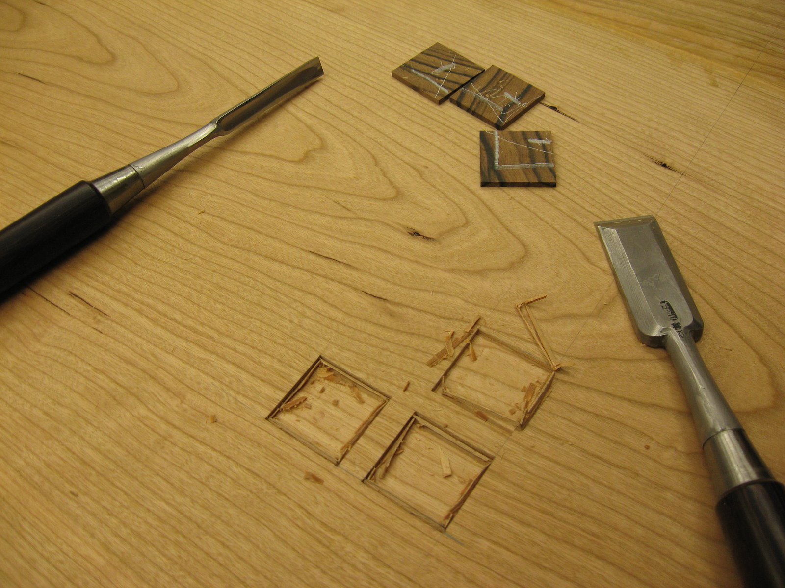 Picking up after the glue up (and the close of Cabaret), next came the inlay process. I was originally planning to inlay rosewood, but a billet of Macassar ebony that has been lurking in the shop for 16 years had some curvy figure that looked promising, so I sliced of a 1/8″ thick piece on the bandsaw and cut it into squares. I then laid out lines with a scalpel so the inlays would land right over the table legs, hogged the bulk of the material out freehand with a router (after burning a couple hours on a router template that was not satisfactory), and cut to the lines with chisels. Love those chisels!