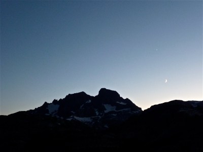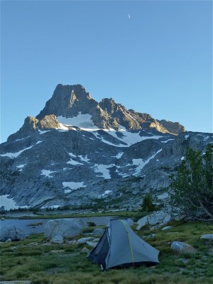 Thousand Island Lake. Foolishly, after several hours I hiked on, planning to return in a day or two. Five miles and dinner later I finished the day by climbing Donahue Pass (which had looked so distant the night before), wandering a few feet into Yosemite National Park to gaze down shadowy Lyell Canyon toward Tuolumne Meadows–it was uncomfortably close to nightfall–and dragging back to camp. I was dragging all the way up as well, looking for any excuse to quit, but the trail is so well graded it seemed lame to turn back.