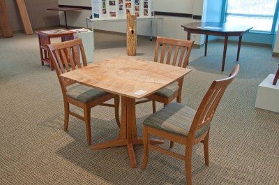 Fast forward: at the show, one hour after the doors opened. Tables look lonely w/out chairs, so I snatched some from my friend Bill Storch’s table. Bill puts up with a lot–he’d already sprayed the table top finish and cured it in his sauna, a story for another time. But he got the last laugh, his table with chairs won best in show. Nice work!