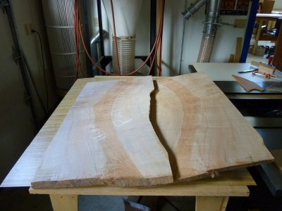 So it was off to the races. After trimming the planks were 17″ wide, proving yet again that whatever size jointer you get–mine is 16″, enormous by small shop standards–it’s never enough. Nonetheless day one ended with the top glued up, a key milestone given how long finishing takes.