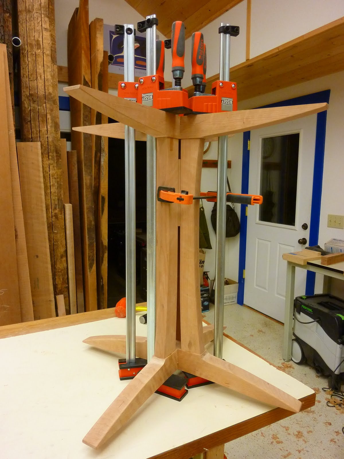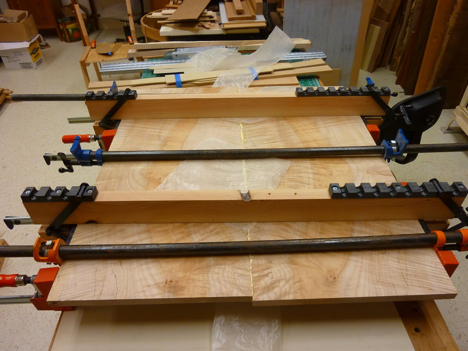 So it was off to the races. After trimming the planks were 17″ wide, proving yet again that whatever size jointer you get–mine is 16″, enormous by small shop standards–it’s never enough. Nonetheless day one ended with the top glued up, a key milestone given how long finishing takes.