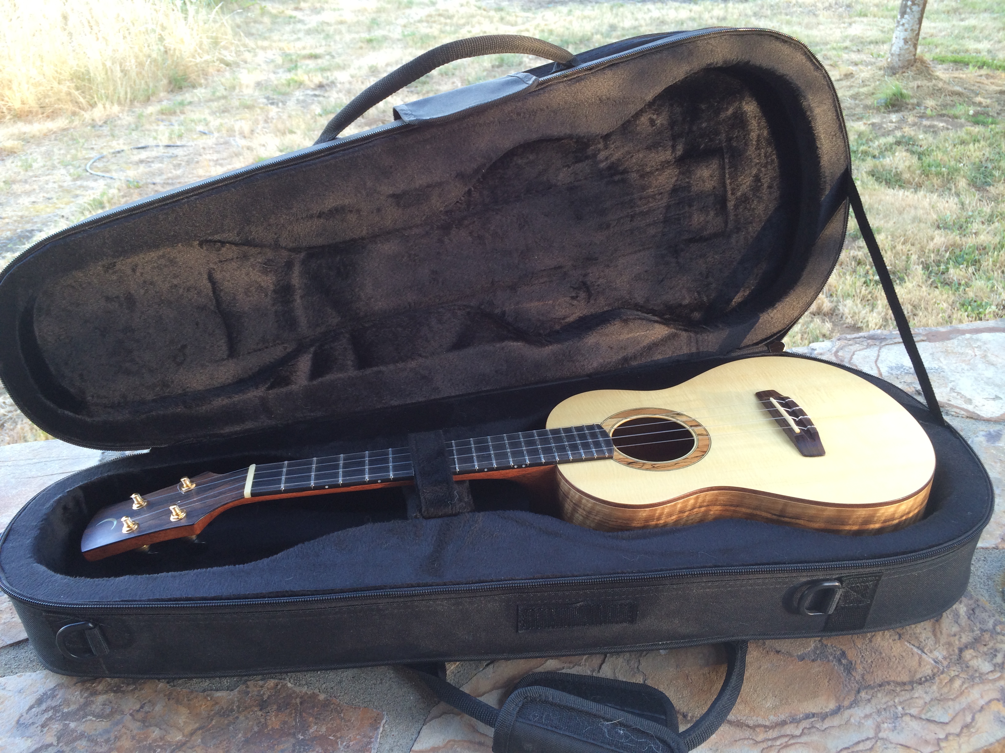 The backs of my instruments are built to move and actively contribute to the sound if allowed to vibrate freely. Try it: play with the back pressed against your body–probably your normal playing position–and again with the back held away. Wow!–when it can vibrate there is extra resonance, volume, sustain, and overall yummy goodness. A large percentage of mandolin players employ a Tone Gard for this purpose, and they can be custom made for your uke as well. It’s best to put it on and leave it, so make sure it will fit your case.