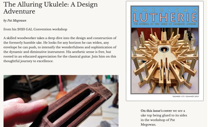 A “Cover Boy” at age 68–how unlikely is that?! But enthusiasm is getting the better of me; it’s really Elisabeth Pfeiffer’s tenor ukulele “Hildi” on the cover of American Lutherie. This is mighty fine company, as many of the world’s great luthiers have graced these pages over the past 50 years.