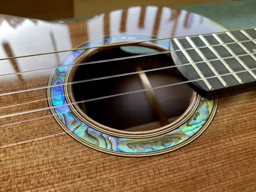 The build process was an adventure—after completing the body, I thought it was excellent but somehow not exactly a “Duke”. After struggling with that for several days I screwed up my courage to call him and suggest that I build it again with sister cuts of both the redwood and rosewood. He admirably hid his doubts about my sanity, and you can hear him make it sing here.