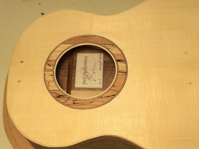 Now, with multiple instruments in process at once, I often name them as an amiable way to think about and discuss them with others. Watson got his name by having English walnut back and sides and a big heart.