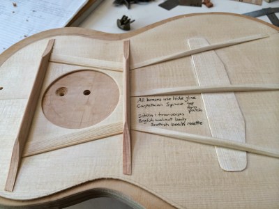 - Bracing: 3 fans and bridge patch of euro spruce, tranverses of Sitka, hide glue